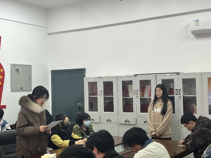 会议的第一项内容是邓民、周少军、杨静、赵明、孟璇、田文瑄、秦源均、路晨虎、付文杰、孟繁达、顾贞十一位同志依次阐述自己成为入党积极分子以来的学习、生活和工作情况,重点汇报了自己在思想上的变化和存在的不足,对应培养人汇报考察意见,他们表示邓民等十一位同志具备了成为中共预备党员的条件,可以提交支部大会讨论。