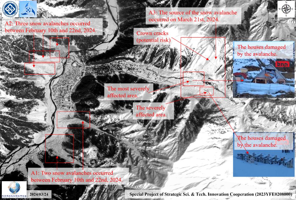 The avalanche incident occurred in Naran, northern Pakistan on March 21, 2024, which submerged houses and hotels, served as a trigger for further in-depth analysis of avalanche risks in the downstream towns and villages. Through comprehensive multi-case studies, it was found that the phenomenon of snow melting into water before heavy precipitation warrants particular vigilance, as it greatly increases the likelihood of avalanches. The spatial-temporal distribution of daily total precipitation was obtained by analyzing data from the Global Precipitation Measurement (GPM) for each day, facilitating an analysis of daily precipitation variations in the region. Subsequently, the Knowledge-Driven Flood Intelligent Monitoring (KDFIM) algorithm, combined with the free accessible Sentinel-1 and Sentinel-2 images of Copernicus Programme, was utilized to infer areas where snow melting into water on ground or slope surface, enabling the identification of early warning signs of snow melting before avalanches. Finally, GF-1B imagery, obtained on March 23 with 2m spatial resolution, from the Land Satellite Remote Sensing Application Center, Ministry of Natural Resources of China, was utilized to analyze the avalanches and assess potential avalanche risks nearby Naran town as in Figure. 1.