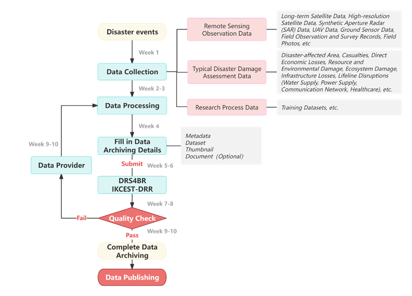 According to this specification, the remittance data include, but are not limited to, the public basic data and disaster case data obtained in the project study. Public basic data refers to the general background and basic information used in the project disaster response research, mainly covering basic geography and natural environment data and human and social development data. There is no strict time requirement for the submission of this kind of data, and the project team can collect and organise them regularly, and it is recommended that the data be submitted once every six months. Disaster case data should be submitted within 10 weeks after a disaster, and the process includes data collection, rapid disaster assessment, disaster damage assessment, quality checking and data submission.