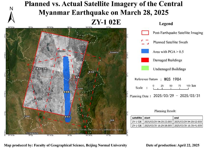 At 14:20 on March 28, 2025, a magnitude 7.9 earthquake occurred in central Myanmar. After the project team initiated the emergency response, seismic parameters such as PGA released by the USGS were promptly obtained. Based on PGA and taking into account the pre-earthquake distribution of buildings, imaging targets for the emergency satellite mission planning were set ( Figure 2).